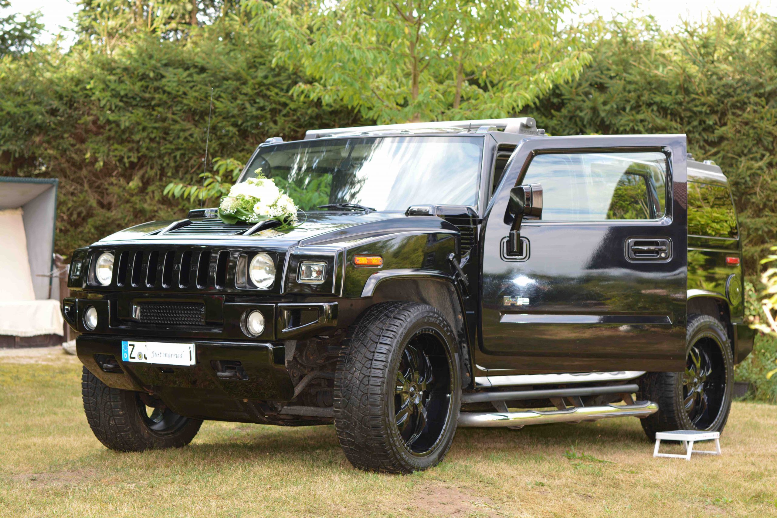 Wir haben für Euch zwei außergewöhnliche Hochzeitsautos, welche Ihr für die Fahrt zur Trauung, zum Shooting oder zur Feier mit Chauffeur bei uns buchen könnt. Zum einen ist es ein weißer Jeep Grand Cherokee und außerdem ein schwarzer Hummer H2. Natürlich können wir uns auch um den entsprechenden Autoschmuck kümmern. Diese Details sprechen wir mit Euch ab und organisieren alles. Ruft uns einfach bei Interesse oder Fragen unter 0172-3456827 an oder schickt eine WhatsApp.